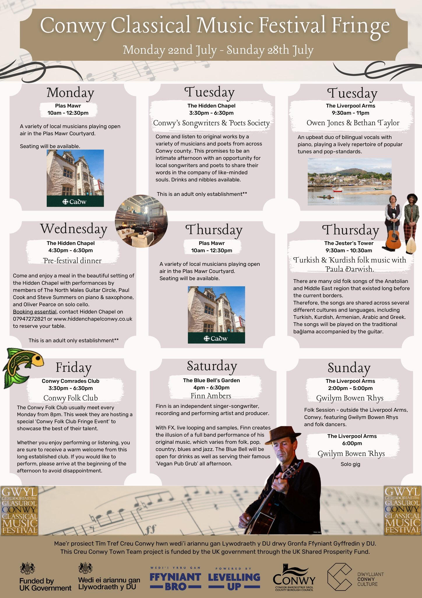 Conwy Fringe was born in 2024. This Creu Conwy Town Team project was funded by the government through the UK Shared Prosperity Fund. Initially designed as a fringe to the highly acclaimed Conwy Classical Music Festival, our aim was to support local artists & local businesses, giving a reason for the local community to come together.